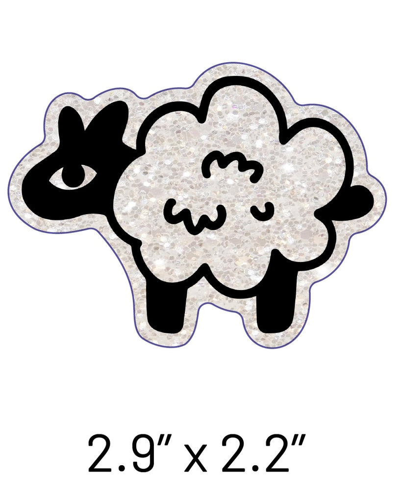 This listing is for a single glitter sheep sticker of Ewegene, Fiber Fever’s resident Ewe!